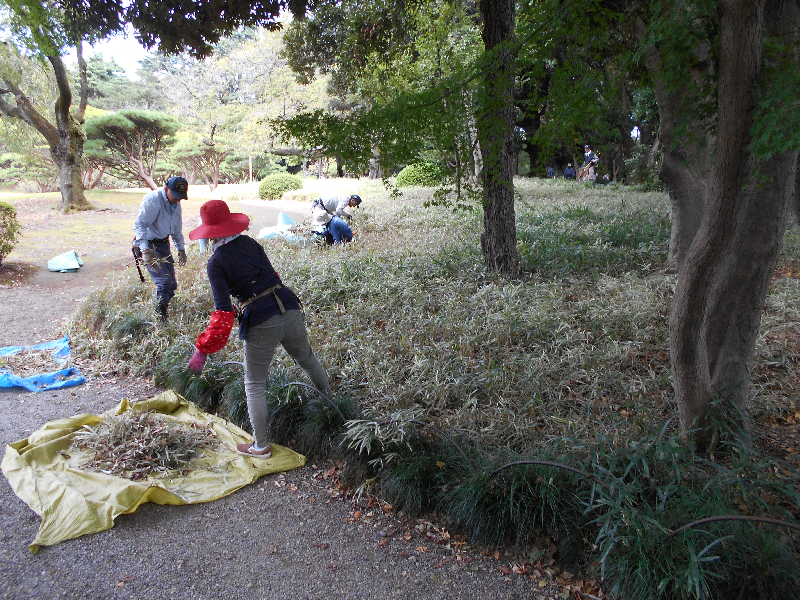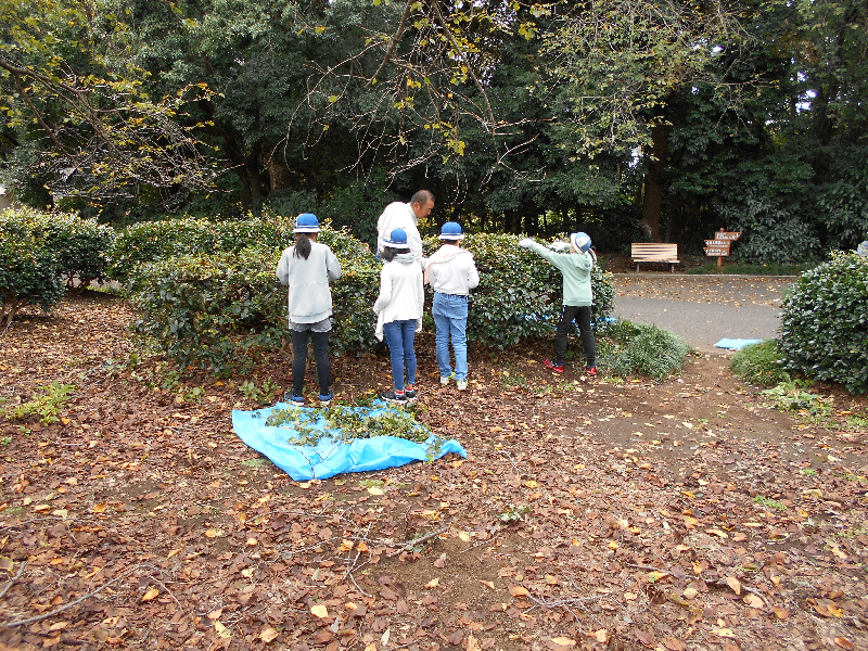 〇Aグループ 新宿門外イトヒバ剪定と除草、カンツバキ飛び枝剪定、花園小学校体験学習支援