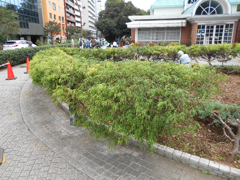 〇Bグループ 新宿門外イトヒバ剪定と除草、カンツバキ飛び枝剪定