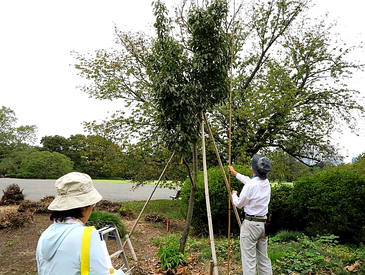 菊花壇展に向け新宿門内、外の樹木伐採、イトヒバ剪定等を行う