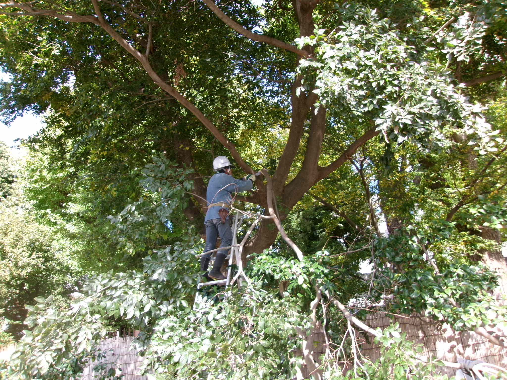 先輩方が率先して脚立に登り高所の剪定をしてくれる