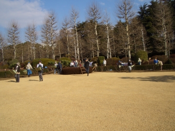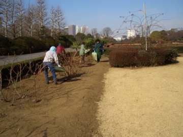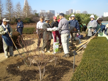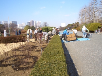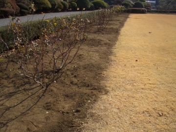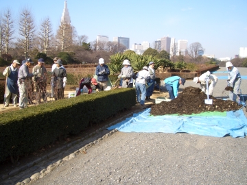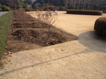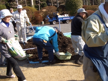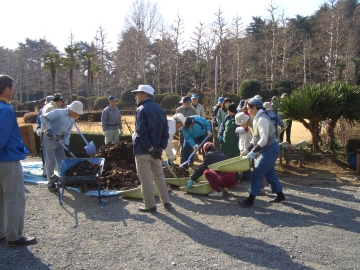 庭園班のヘルプを得て 腐葉土撒き 及び 寒肥(化成肥料)の散布。