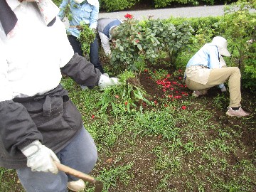 つるバラ、ニュードーンの整枝での伐採枝の集め | 東園東西側潜り込んでの除草 |