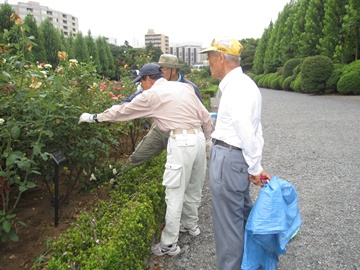 本日の作業― 先週に引き続き花壇バラの夏仮剪定を行う。剪定前に先週の反省注意事項の説明あり。