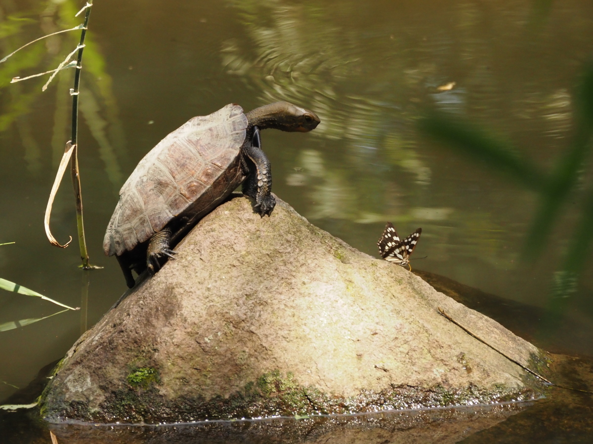 8月18日 ニホンイシガメとゴマダラチョウが上の池の石の上にいました。