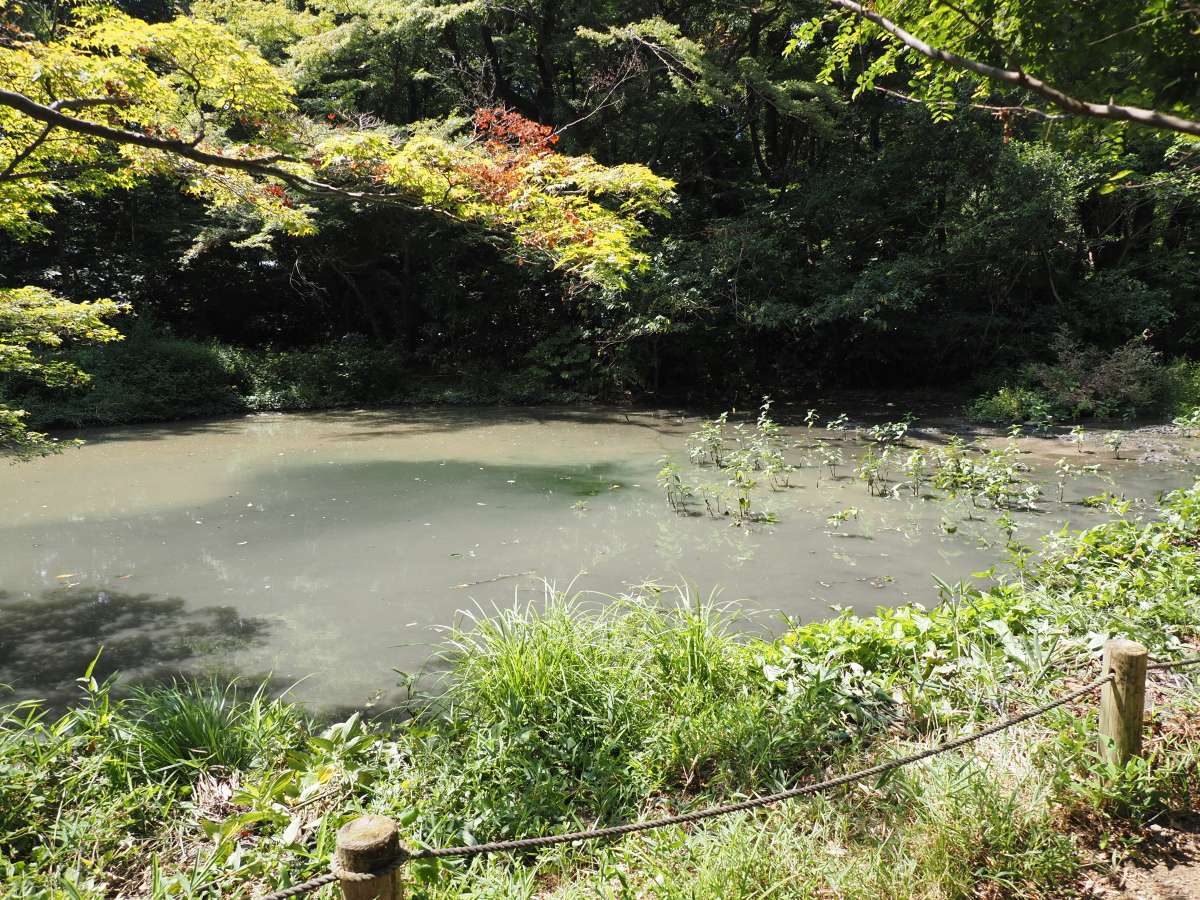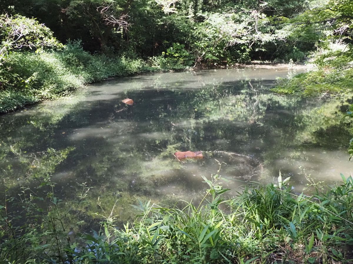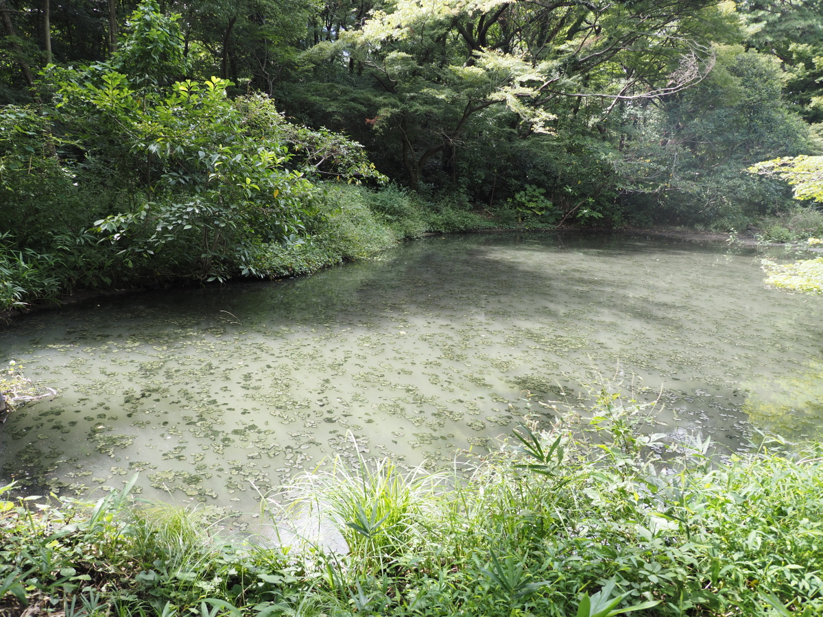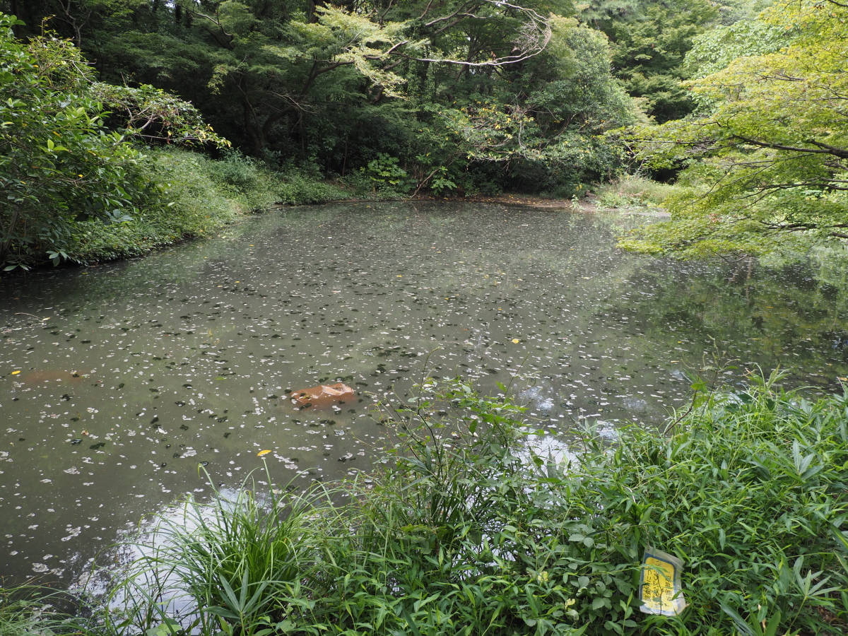 9月22日、下の池の様子、アオミドロが浮かび、濁っている。