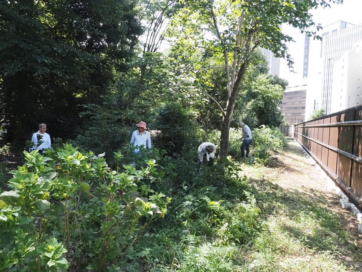 9月1日、くぬぎ通りのくぬぎの木の周辺の草刈りとアジサイの剪定も行ないました